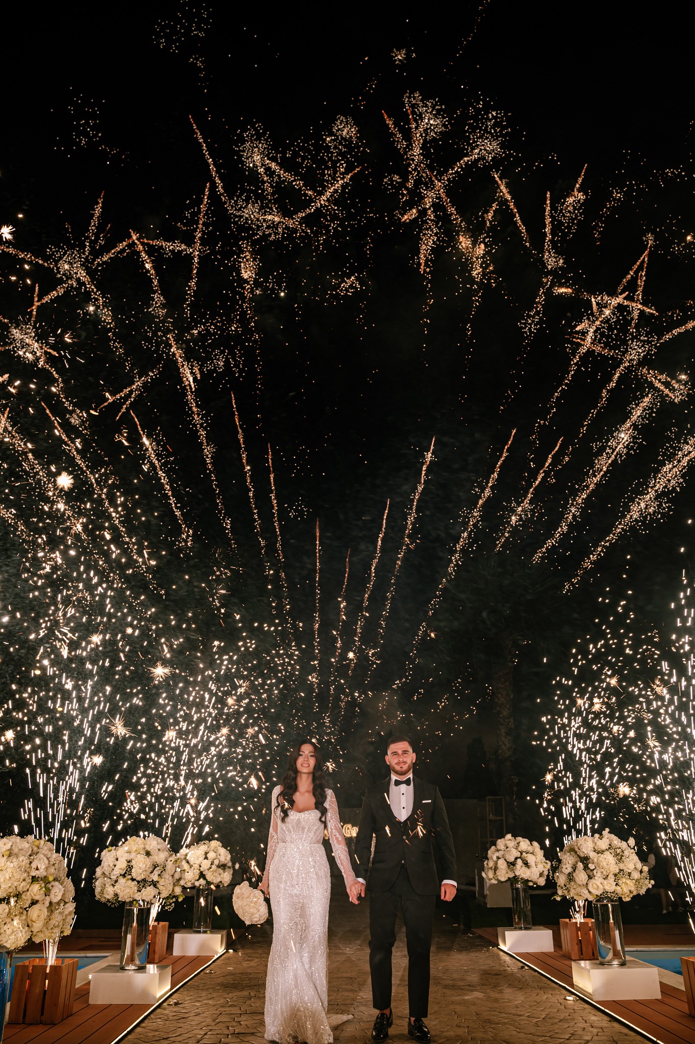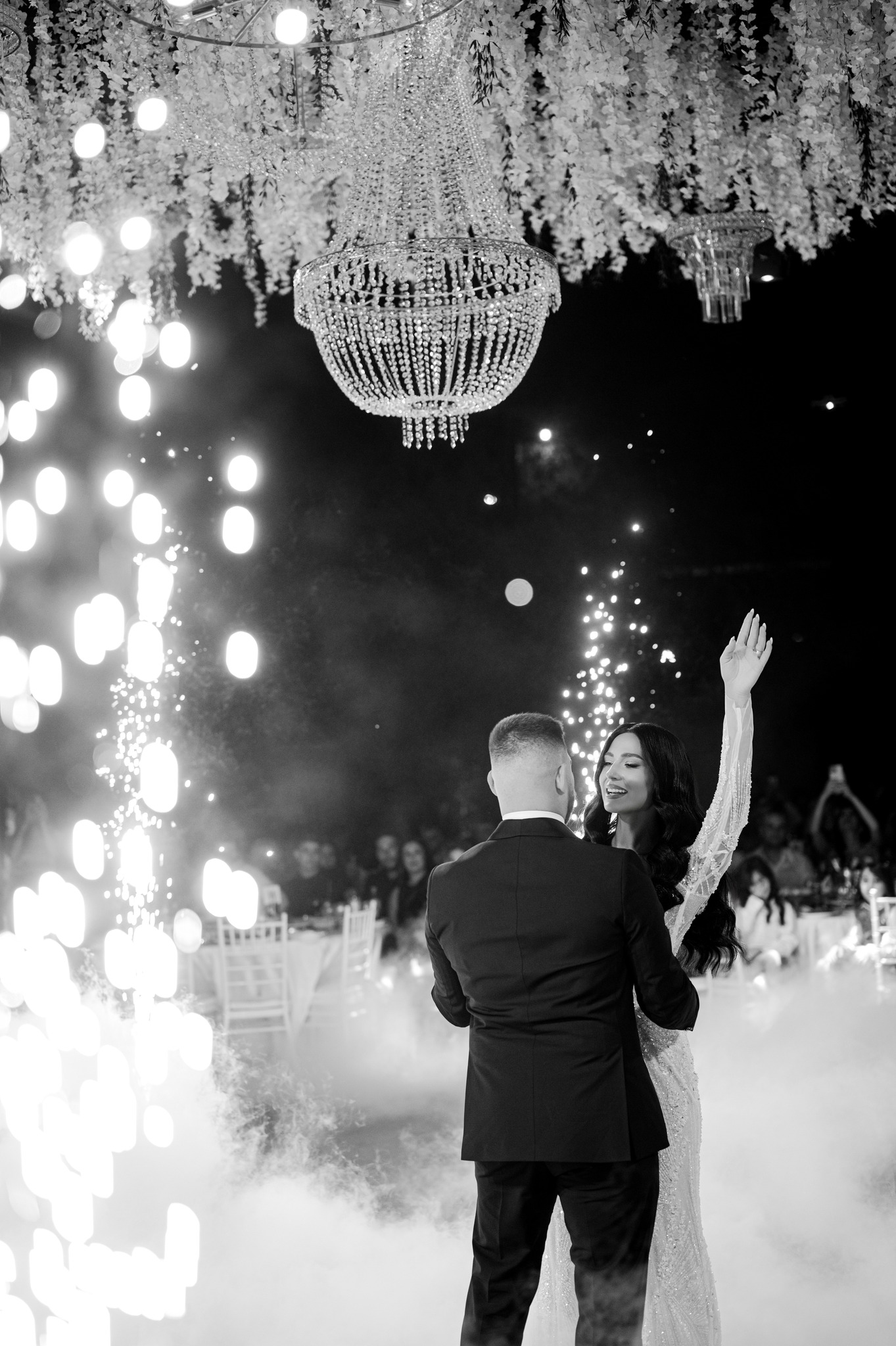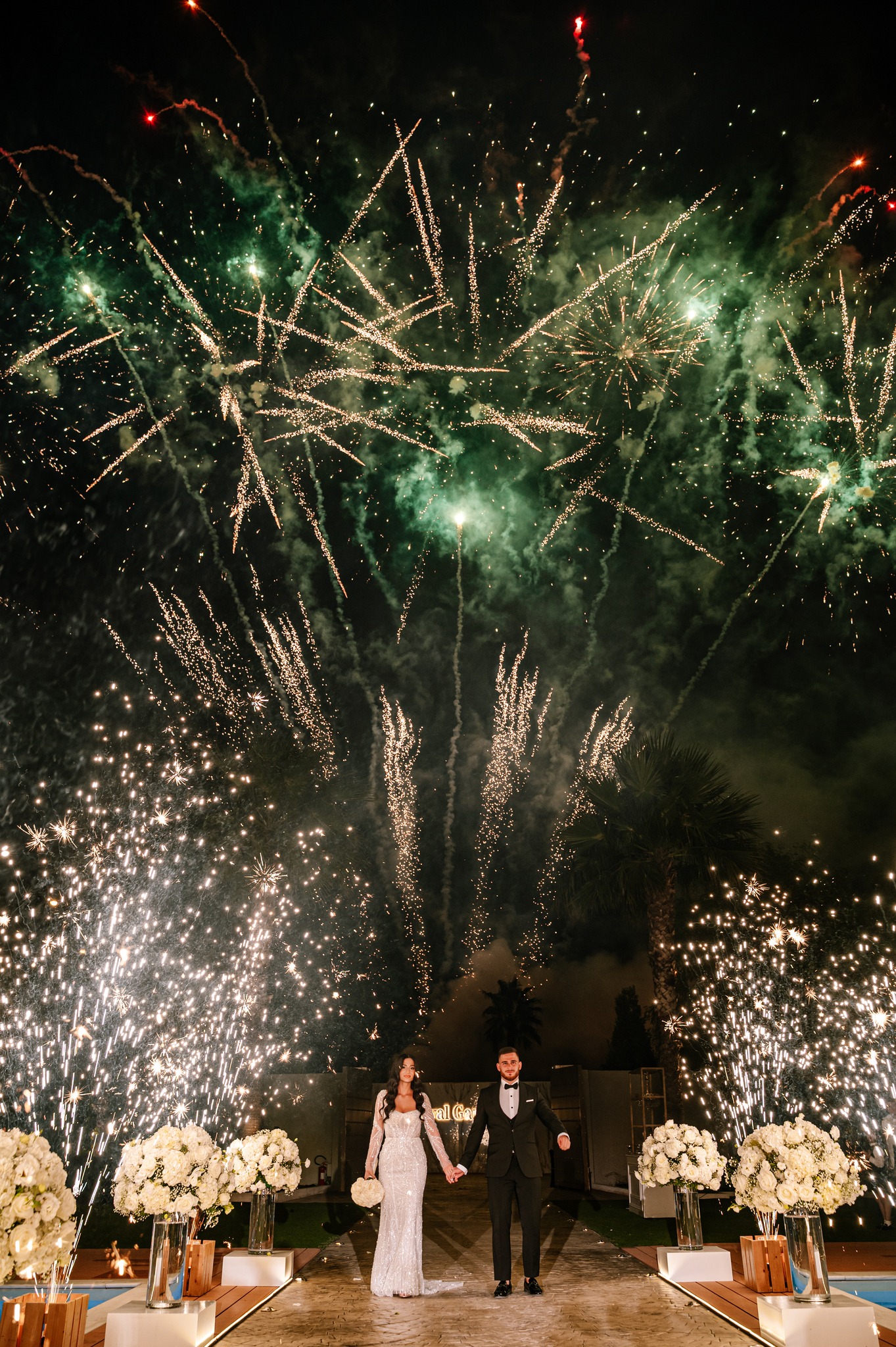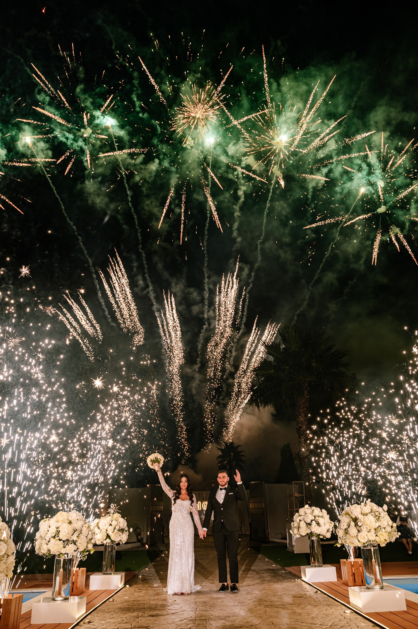 Η είσοδος του ζευγαριού ήταν βγαλμένη από παραμύθι. Φωτεινά πυροτεχνήματα φώτισαν τον ουρανό καθώς οι νεόνυμφοι περπατούσαν στον χώρο της δεξίωσης, σηματοδοτώντας την αρχή μιας μαγικής βραδιάς. Ο στολισμός, επιμέλεια του Poimenidis, ήταν κάτι παραπάνω από εντυπωσιακός. Λευκά άνθη και εντυπωσιακοί πολυέλαιοι δημιούργησαν μια ατμόσφαιρα γεμάτη λάμψη και ρομαντισμό. Το ζευγάρι χόρεψε τον πρώτο του χορό μέσα σε μια ομίχλη που έκανε τη στιγμή ακόμα πιο μαγική.