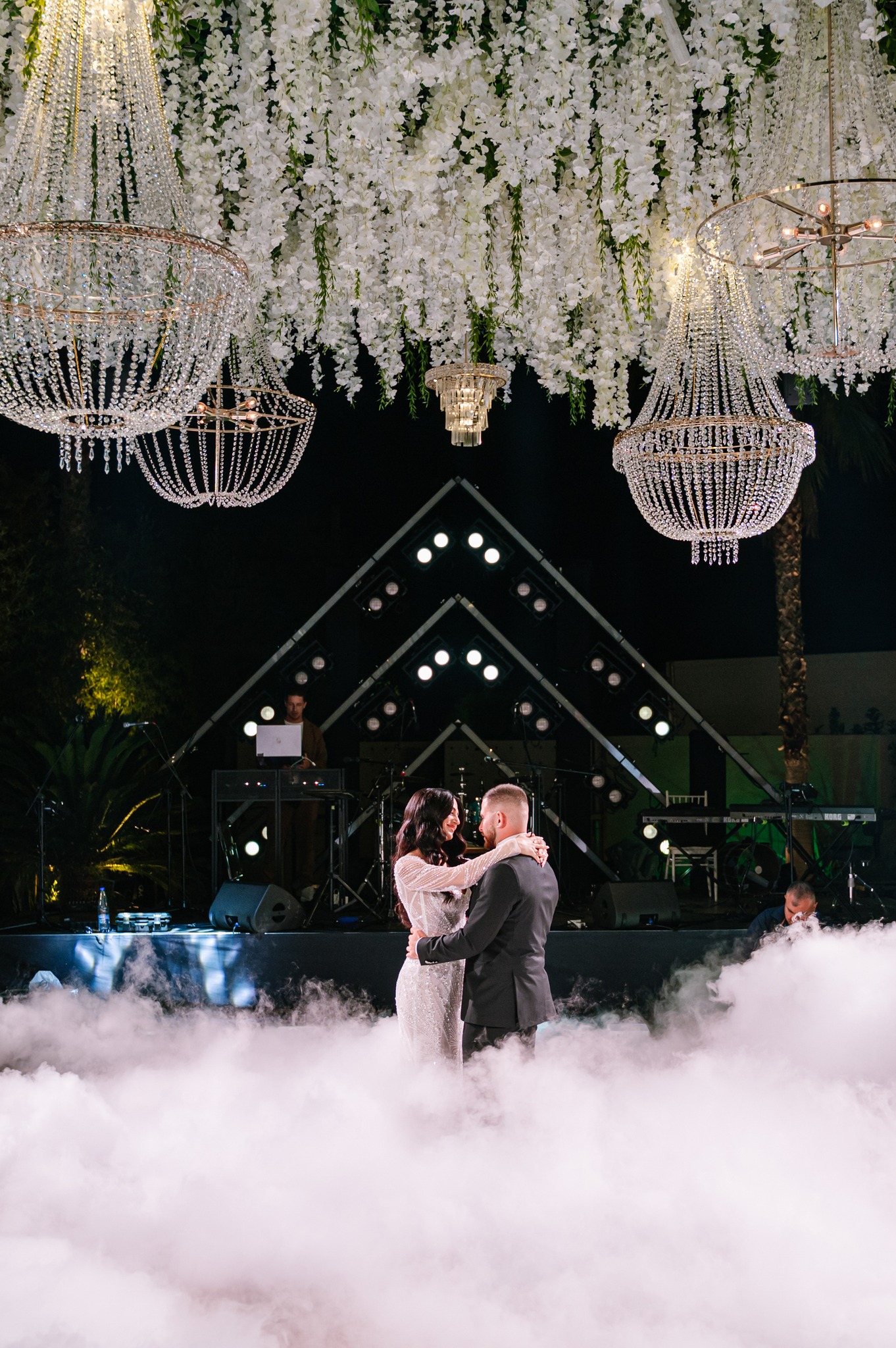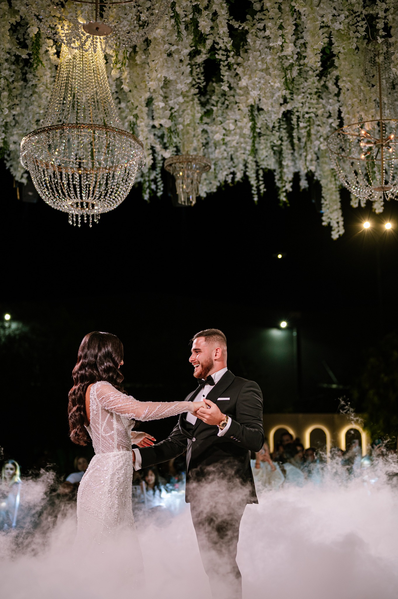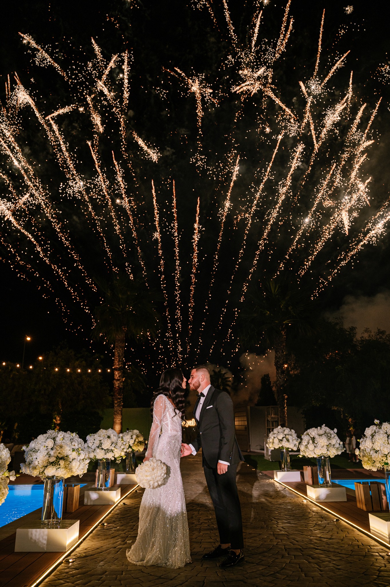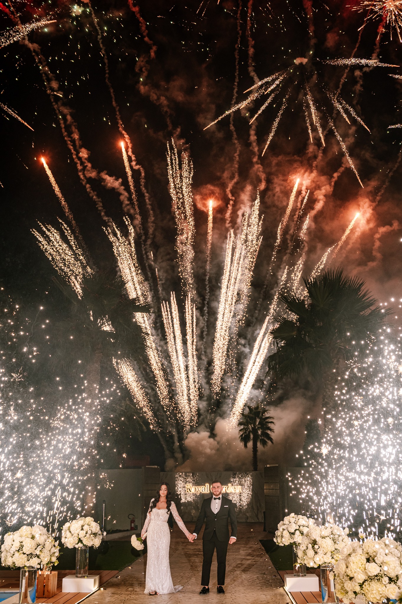 Η είσοδος του ζευγαριού ήταν βγαλμένη από παραμύθι. Φωτεινά πυροτεχνήματα φώτισαν τον ουρανό καθώς οι νεόνυμφοι περπατούσαν στον χώρο της δεξίωσης, σηματοδοτώντας την αρχή μιας μαγικής βραδιάς. Ο στολισμός, επιμέλεια του Poimenidis, ήταν κάτι παραπάνω από εντυπωσιακός. Λευκά άνθη και εντυπωσιακοί πολυέλαιοι δημιούργησαν μια ατμόσφαιρα γεμάτη λάμψη και ρομαντισμό. Το ζευγάρι χόρεψε τον πρώτο του χορό μέσα σε μια ομίχλη που έκανε τη στιγμή ακόμα πιο μαγική.